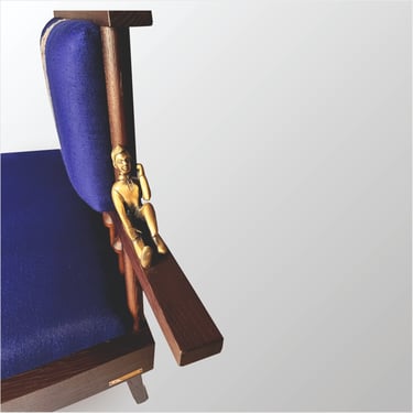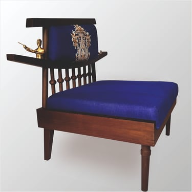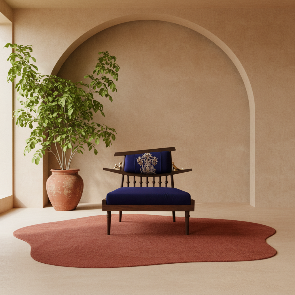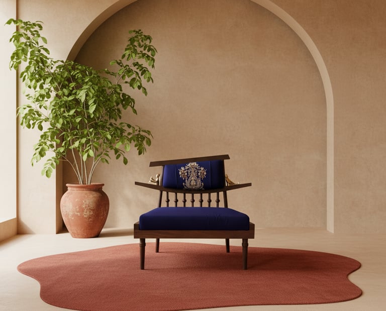 Our lounge chair is a statement of calm luxury, inspired by Kashmir. Crafted from European oak wood its design echoes the gentle curves of a shikara gliding over Dal Lake. The gracefully arched backrest mirrors the boat’s silhouette, adorned with handcrafted brass figurines of a boatman and passenger, capturing a moment of a quiet journey. Draped in ultra-fine fabric, embroidered with traditional Kashmiri Aari art, the chair tells a story of heritage and tranquility, inviting you to sink into serenity.